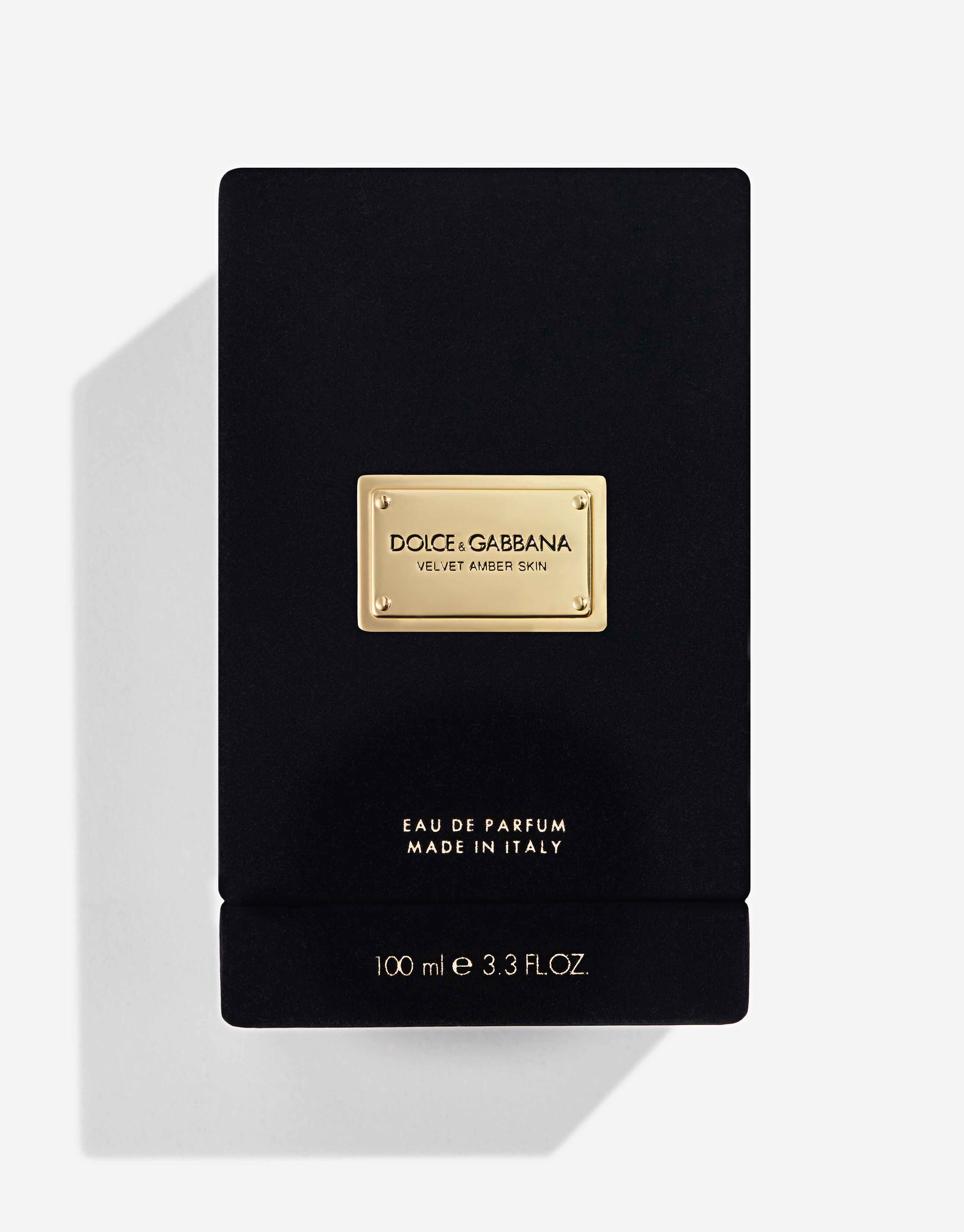 The iconic, weighty glass flacon of the Dolce&Gabbana Velvet Collection is topped with a yellow velvet-trimmed stopper with golden accents. The flacon of Dolce&Gabbana Velvet Amber Skin Eau de Parfum is also personalized with an engraved golden plate, and comes encased in a black velvet coffret.