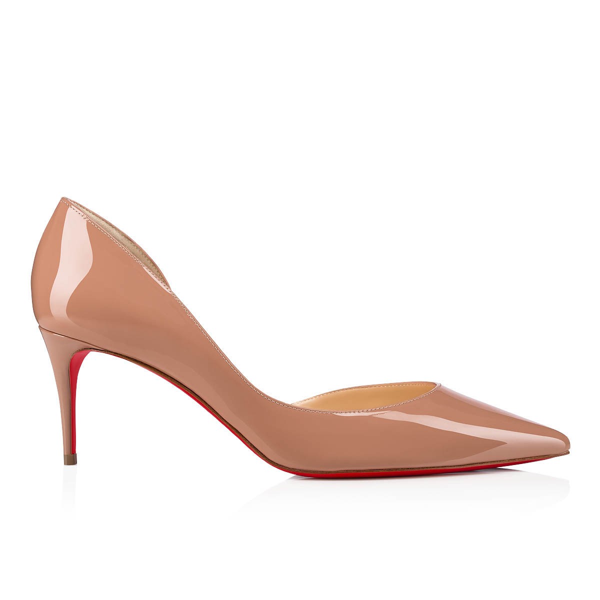 クリスチャン ルブタンならではのハーフドルセースタイルを、なめらかなベージュのパテントレザーでタイムレスに仕上げたIriza。