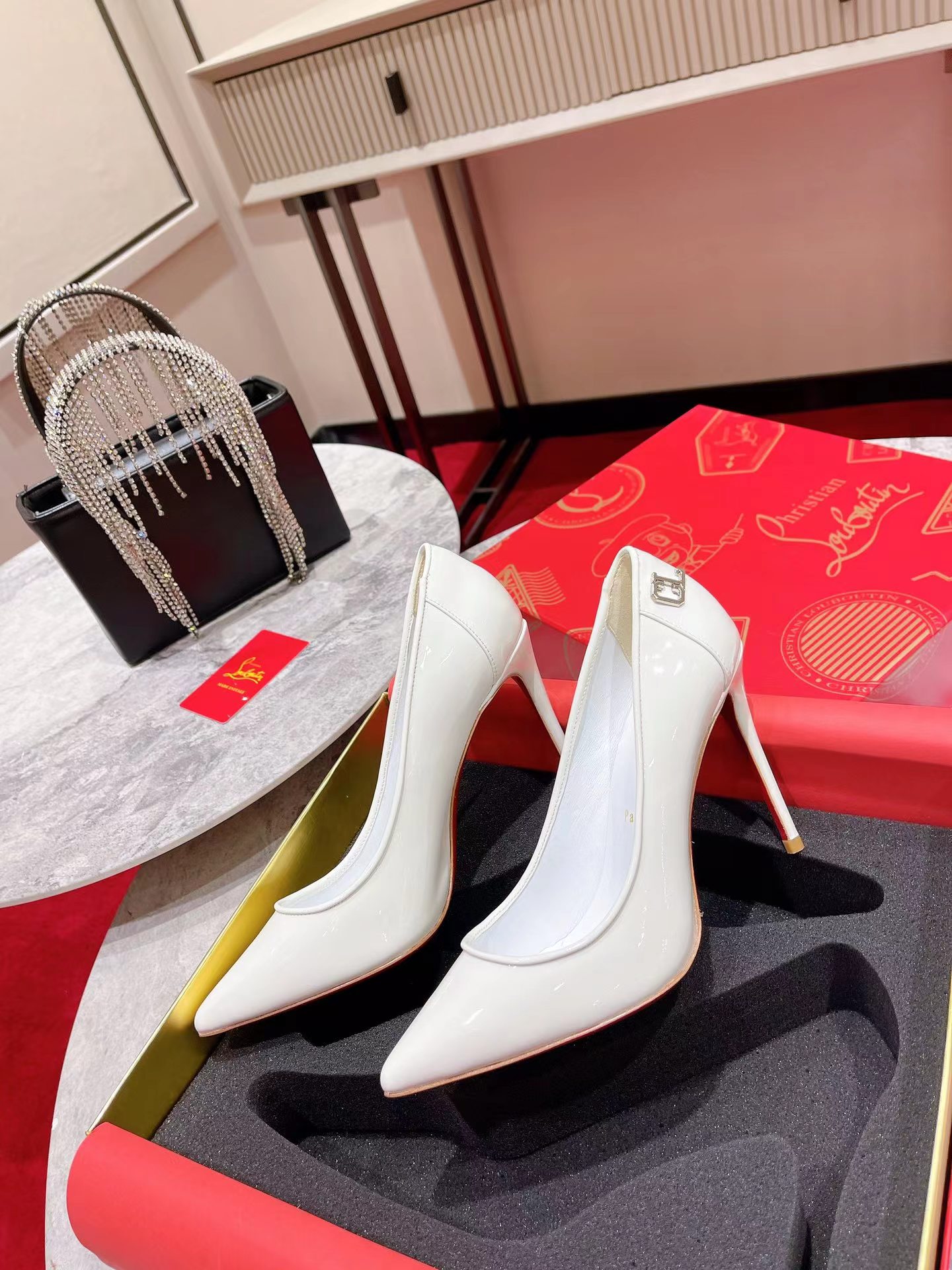 洗練された魅力を放つタイムレスでモダンな印象のパンプス、Sporty Kate。ポインテッドトウに足元をエレガントに演出するディープカットしたヴァンプを合わせ、85㎜ヒールで仕上げました。柔らかなホワイトのパテントレザーを使用し、背面にはクリスチャン ルブタンのモノグラムが彩りを添えます。