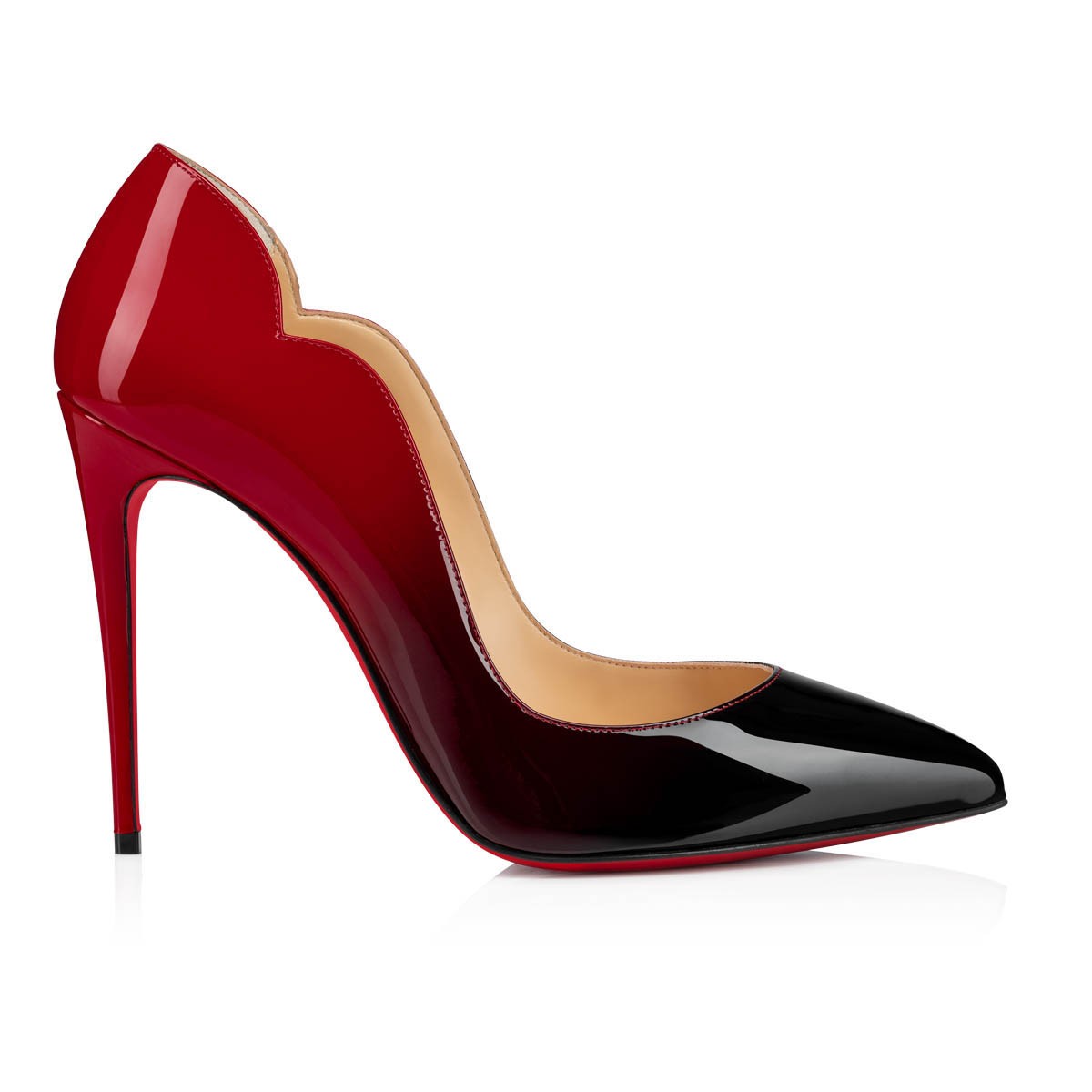 A modern style, the Hot Chick stiletto pump is made of patent leather in a black-to-red color gradient. Its pointed-toe and curved openings unveil the foot with elegance. Its 100mm heel raises the silhouette with weightlessness, marking the savoir-faire of the Maison Christian Louboutin.