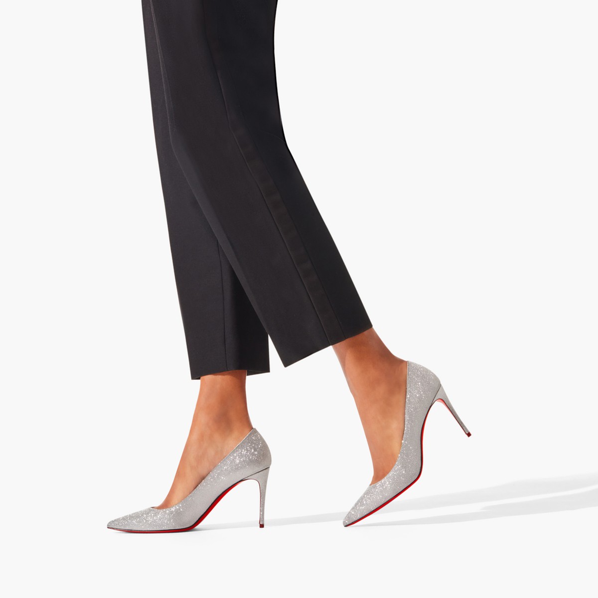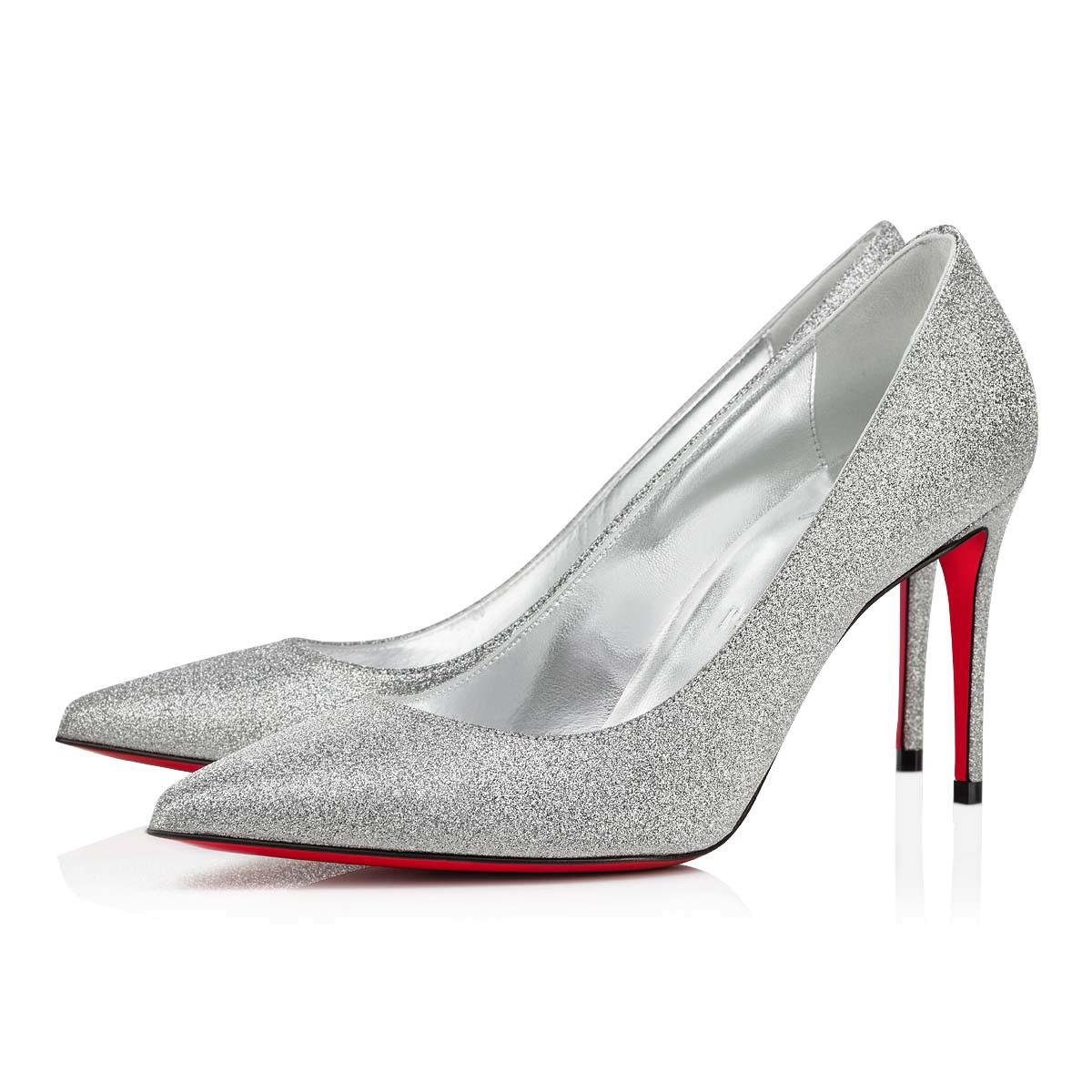 大胆なカッティングが足元をエレガントに引き立てる、クリスチャン ルブタンならではのアイコニックなパンプス、Kate。全体にはシルバーのグリッターカーフレザーを使用し、100㎜のスティレットヒールで仕上げました。ポインテッドトウと控えめなデザインが特徴の都会的なラインが、タイムレスな洗練さを演出します。